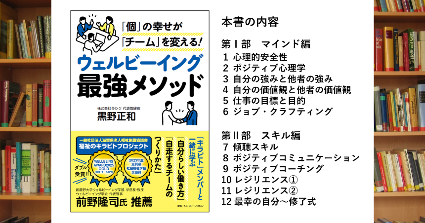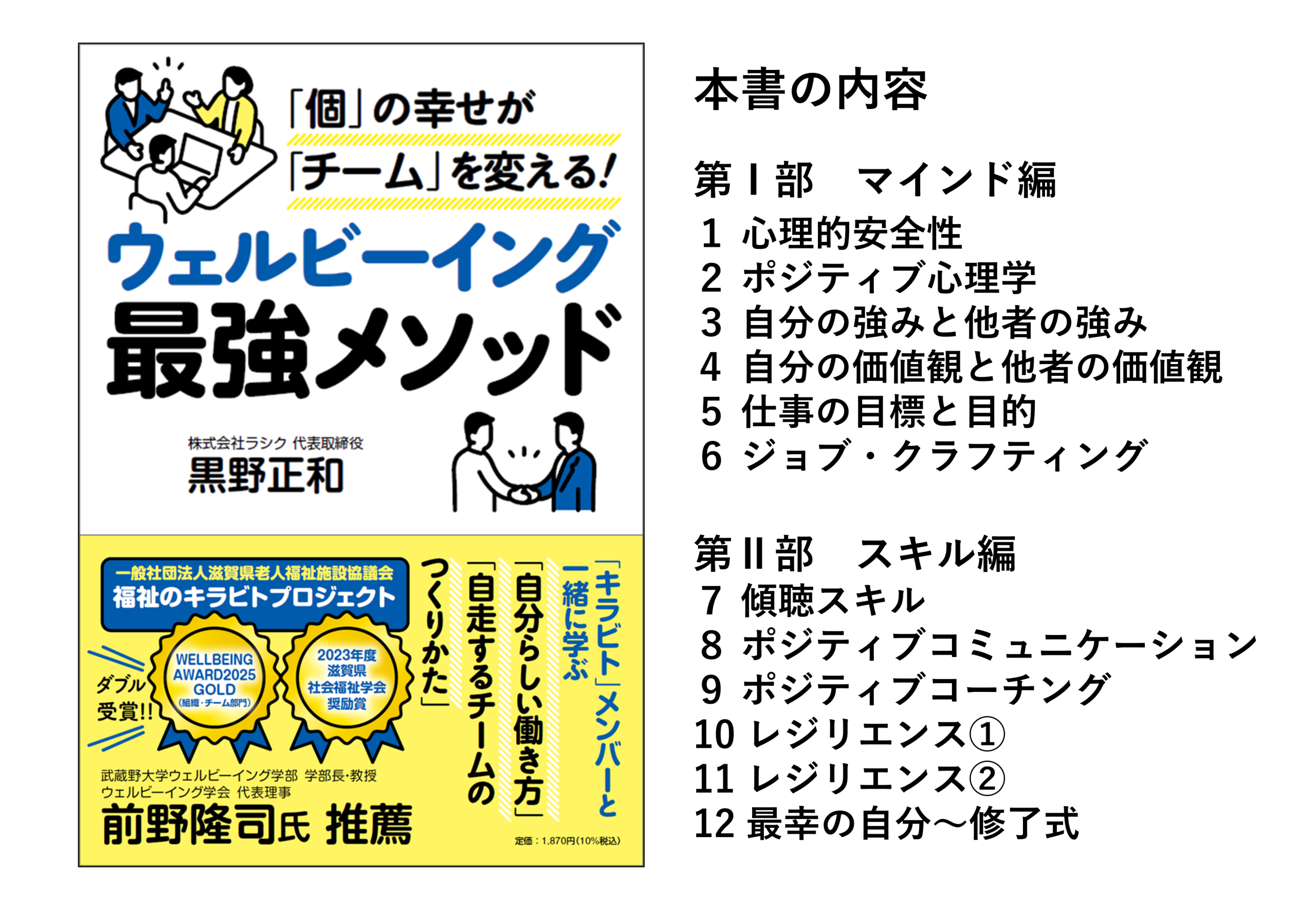 株式会社ラシク(本社:京都府京都市、代表取締役:黒野正和)は、当社の人財育成コンサルティング支援のもと、一般社団法人滋賀県老人福祉施設協議会が実施する「福祉のキラビトプロジェクト」が「ウェルビーイング・アワード2025 組織・チーム部門」でゴールドを受賞したことを受け、この成功事例をまとめた書籍『「個」の幸せが「チーム」を変える!ウェルビーイング最強メソッド』(PHPエディターズ・グループ)を2025年9月30日に発売しました。